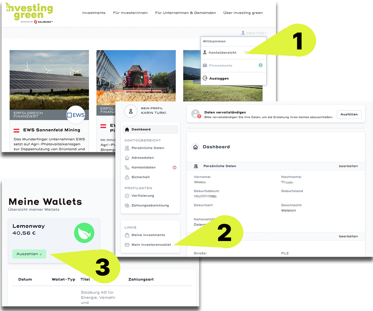 Im Zuge der Umstellung wird Ihr bisheriges Lemonway-Wallet bei investinggreen geschlossen. Da der Vertrag mit Lemonway mit Ende März 2026 endet, können Auszahlungen nach diesem Zeitpunkt nicht mehr über diese Plattform durchgeführt werden. Eine Auszahlung ist dann nur noch direkt über Lemonway möglich.